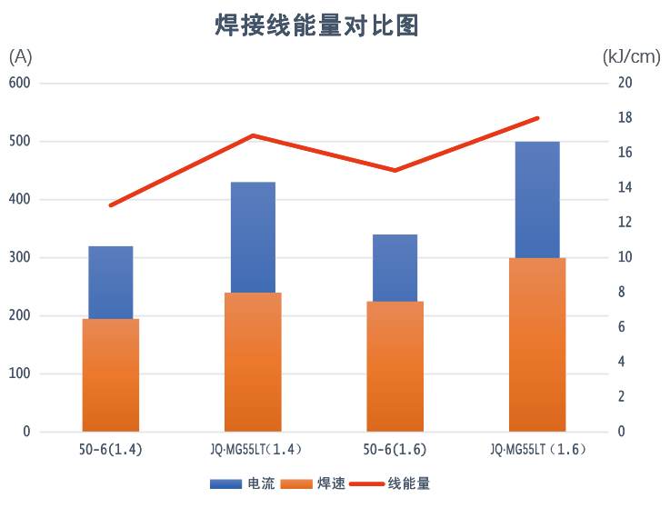 高效率(高填充率)焊接,與同等規(guī)格焊絲50-6相比,JQ·MG55LT焊絲填充效率提升106%。 |