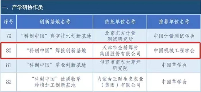 “科創(chuàng)中國”創(chuàng)新基地是中國科協(xié)推動產(chǎn)學(xué)研協(xié)同創(chuàng)新和科技成果轉(zhuǎn)移轉(zhuǎn)化的合作載體,是“科創(chuàng)中國”各類資源下沉匯聚的承接平臺,旨在促進跨界、跨域、跨境集聚配置創(chuàng)新資源,動員更多人才、技術(shù)、數(shù)據(jù)、資本等創(chuàng)新資源,助力地方經(jīng)濟高質(zhì)量發(fā)展。金橋集團憑借良好的創(chuàng)新基地基礎(chǔ)、過硬的產(chǎn)品研發(fā)和科技攻關(guān)能力以及出色的產(chǎn)學(xué)研落地轉(zhuǎn)化成果,被認(rèn)定為“科創(chuàng)中國”焊接創(chuàng)新基地,成為天津四家入選產(chǎn)學(xué)研協(xié)作類“科創(chuàng)中國”創(chuàng)新基地的單位之一。